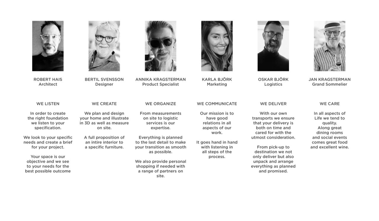 When moving to Spain, we will help you with your new home. From interior consultation, visualisations, purchasing, transport and finished installation. We are a team of Architect, Designer, Product Specialists and with our own transports we ensure the highest quality and service. All the leading Scandinavian brands that we collaborate with, as well as handpicked partners on site, such as textile and kitchen suppliers, builders, designers, brokers, etc., are there to give you all the conditions for an exclusive and pleasant home. Welcome to our Showroom in Malaga for a private consultation. Annika, Bertil, Karla, Oskar, Jan and Robert